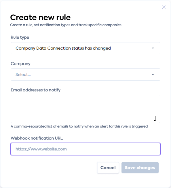 | Rule type | WebhookWebhook An automated notification sent from Codat to your application when specific events occur, such as when data syncs complete or connections change status. notification URL |